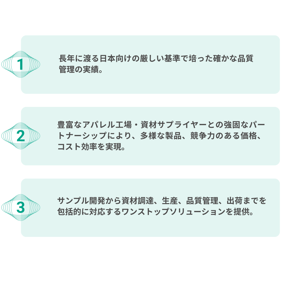 当社は単なる調達にとどまらず、信頼できるパートナーを厳選し、厳格な品質管理とコスト最適化を実現しています。長年にわたる工場ネットワークと日本式生産管理を融合し、信頼性と競争力の高いアパレルソリューションを提供いたします。