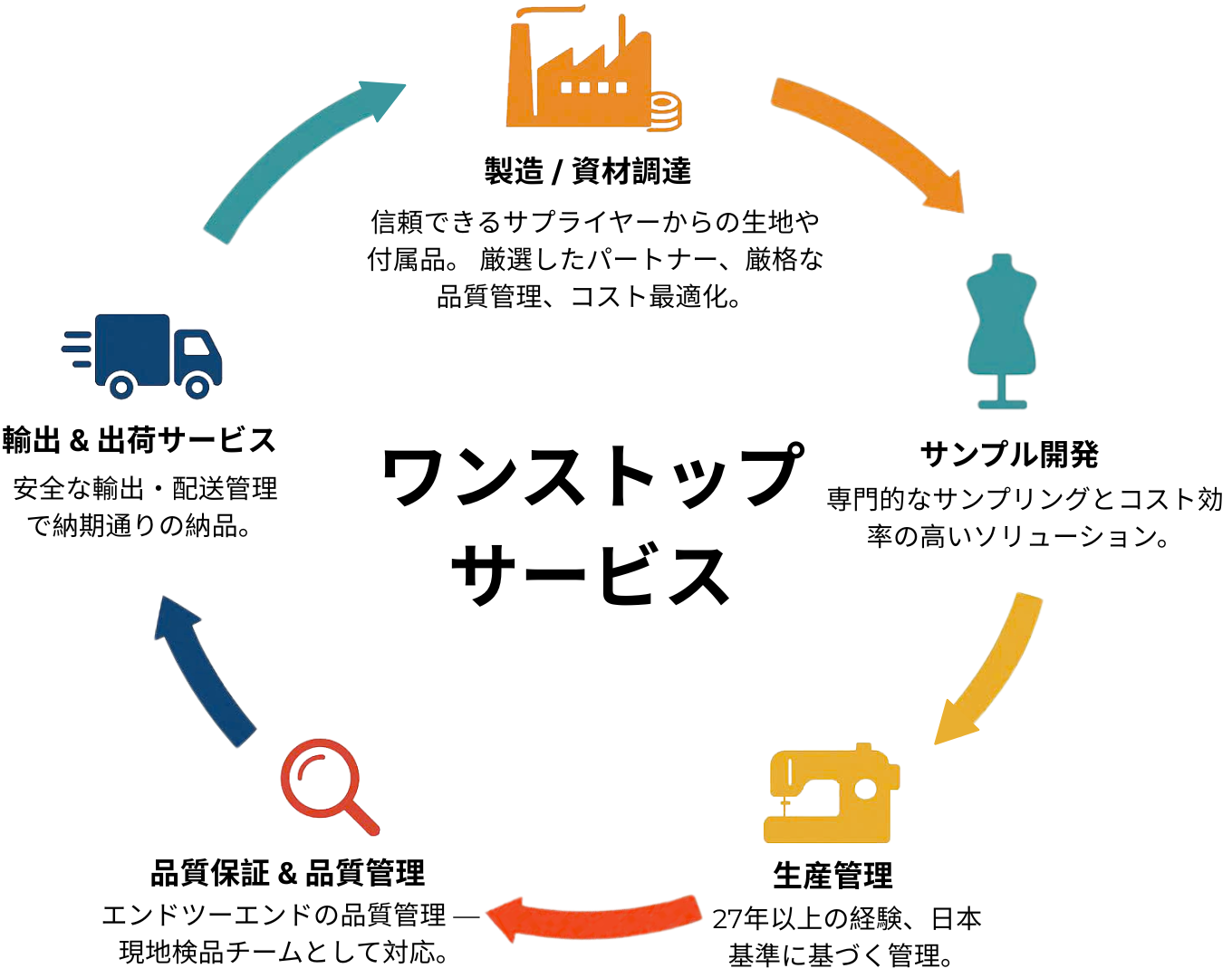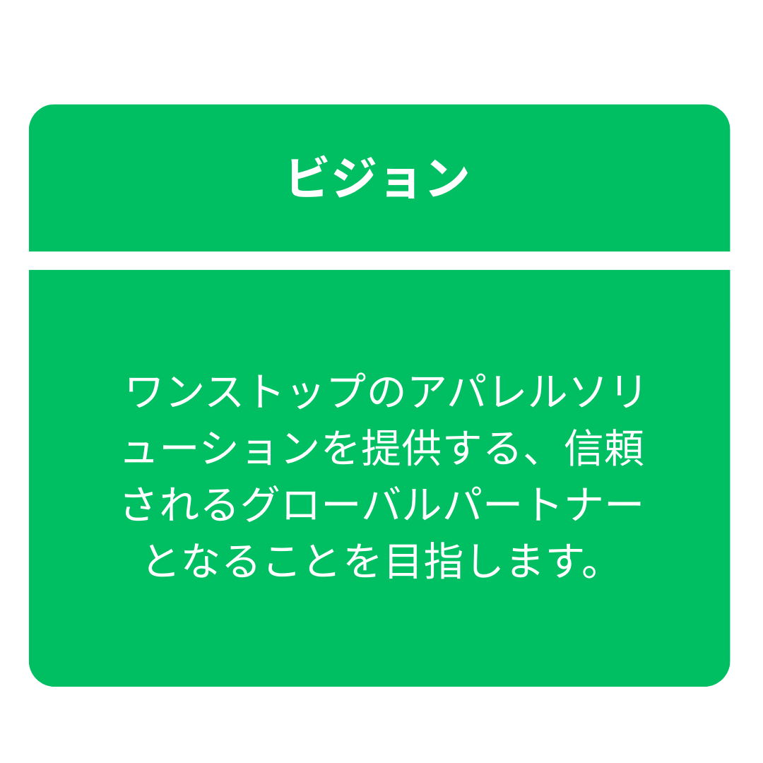 当社はメーカー調達および開発を専門としており、お客様と信頼できる縫製工場や資材サプライヤーをつなぐ役割を担っております。